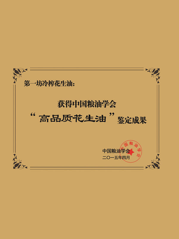 2015年 第一坊冷榨花生油榮獲中國(guó)糧油學(xué)會(huì)“高品質(zhì)花生油”糧油科技成果鑒定